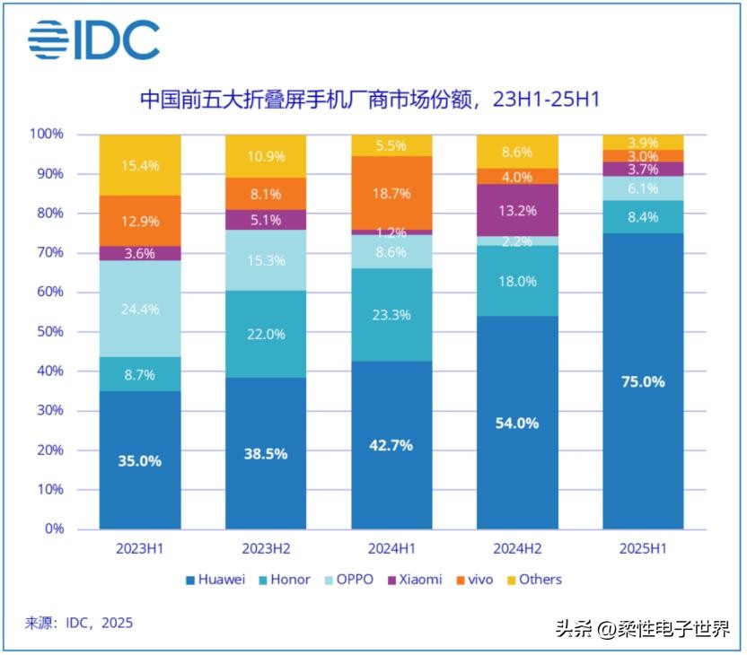 从折叠屏手机出货量来看,据IDC数据,2025年上半年,中国折叠屏手机市场出货量达到498万台,同比增长12.6%。而华为出货量达到了374万台,占75%的市场份额,创下历史新高,成为首个折叠屏手机累计出货量突破1000万台的中国品牌。