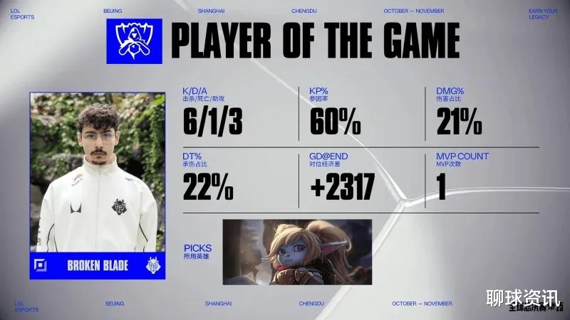 上单压制:波比在训练赛中已证明对奎桑提的克制效果,比赛中 BrokenBlade 更是完成单杀,直接打乱 BLG 的对线节奏。