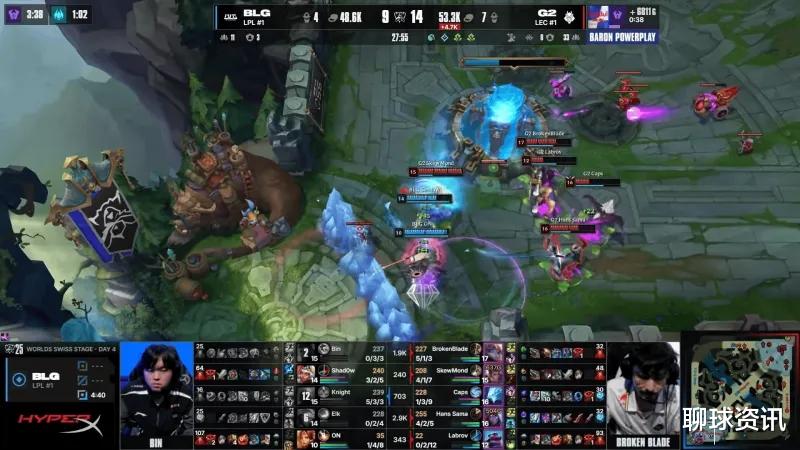27 分钟决胜团:G2 在下路推进,BLG 女坦大招开团,但 Caps 的冰墙精准分割阵型。SkewMond 的赵信从侧翼切入,EQ 挑起四人后接大招横扫,配合韦鲁斯的穿透伤害完成 0 换 5 团灭。赵信斩获四杀,G2 推平基地,仅用 27 分钟锁定胜局。
