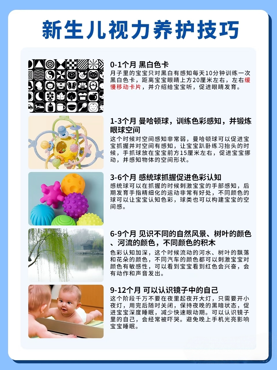 0-12个月是宝宝眼睛和视力发育的黄金期,黑白卡→曼哈顿球→感统球→大自然→镜子,一步一步来,别着急,也别偷懒。