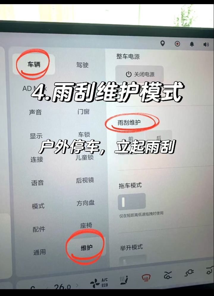 4️⃣雨刮维护模式:冰雪天气户外停车,建议开启该模式后把雨刮立起,防止雨刮冻住✅