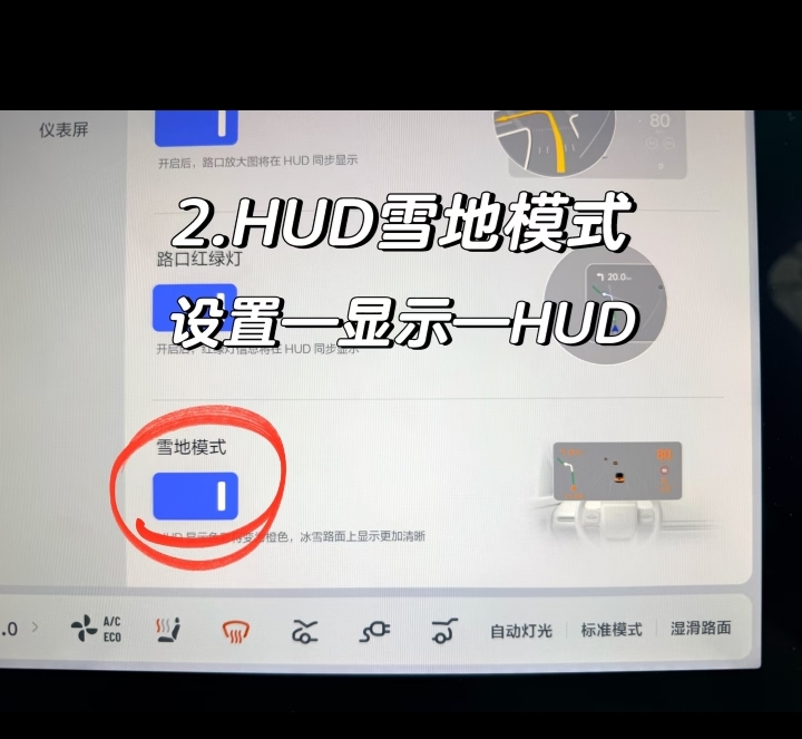 2️⃣HUD雪地模式:开启后HUD会切换为亮橙色显示,在白色背景下更清晰,增强行车安全✅
