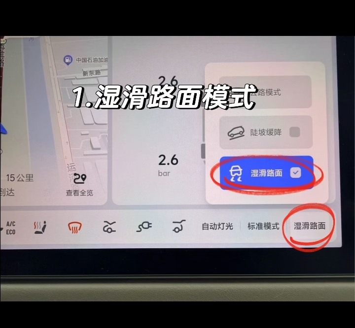 1️⃣湿滑路面模式:开启后系统会放缓油门响应、限制动力扭矩,防止起步打滑️,同时方向盘手感加重,减弱动能回收,提升行车稳定性✅
