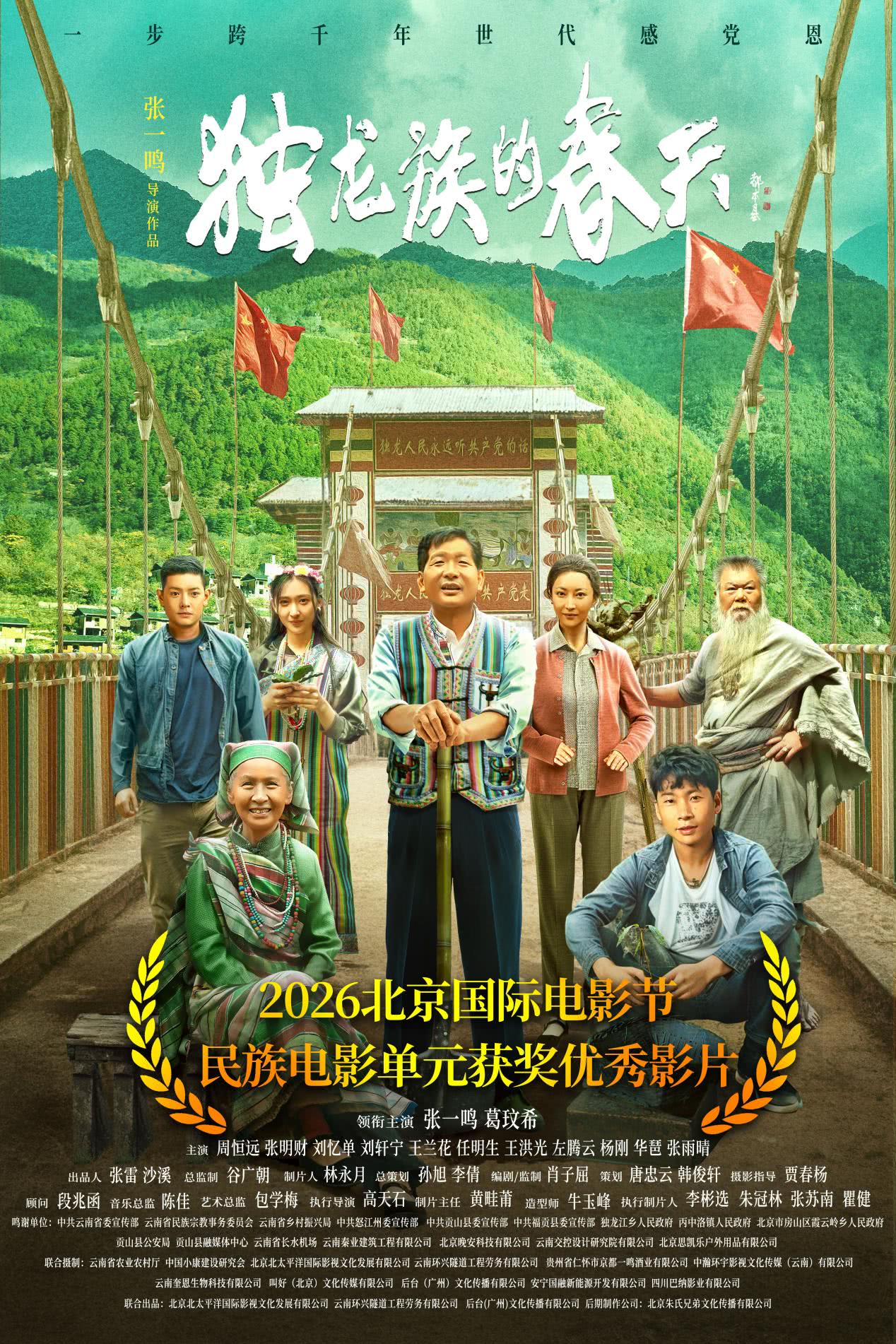作为国内首部全景展现独龙族发展变迁的院线电影,《独龙族的春天》历时五年精心创作,扎根云南独龙江真实生活。影片以张一鸣饰演的孔敢为主线,讲述独龙族群众在时代浪潮中摆脱闭塞、整族脱贫、实现跨越式发展的动人故事,串联起独龙族独特民俗、山川风物与乡土情怀,用小人物命运折射大时代变迁,生动诠释乡村振兴、民族团结的时代精神。影片既还原深山村寨的岁月过往,也展现公路贯通、家园焕新、百姓安居的崭新风貌,兼具艺术审美、人文价值与现实意义。