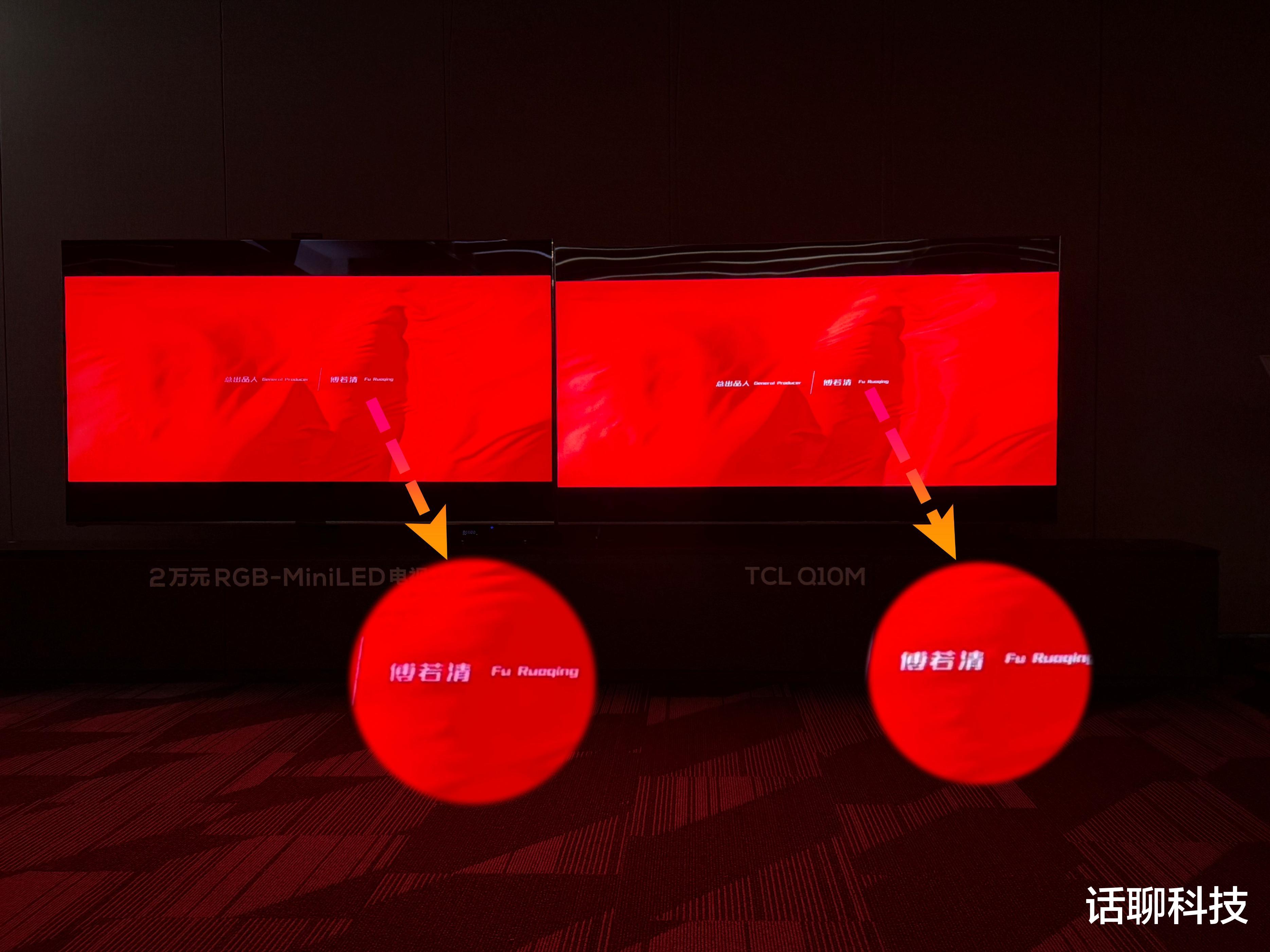 再比如串色的问题,确实是RGB-Mini LED 电视更严重一点。比如同样是播放红色背景的白色字幕,Q10M的白色就会比较保真,而对比的RGB电视就会出现白色字幕偏红紫。