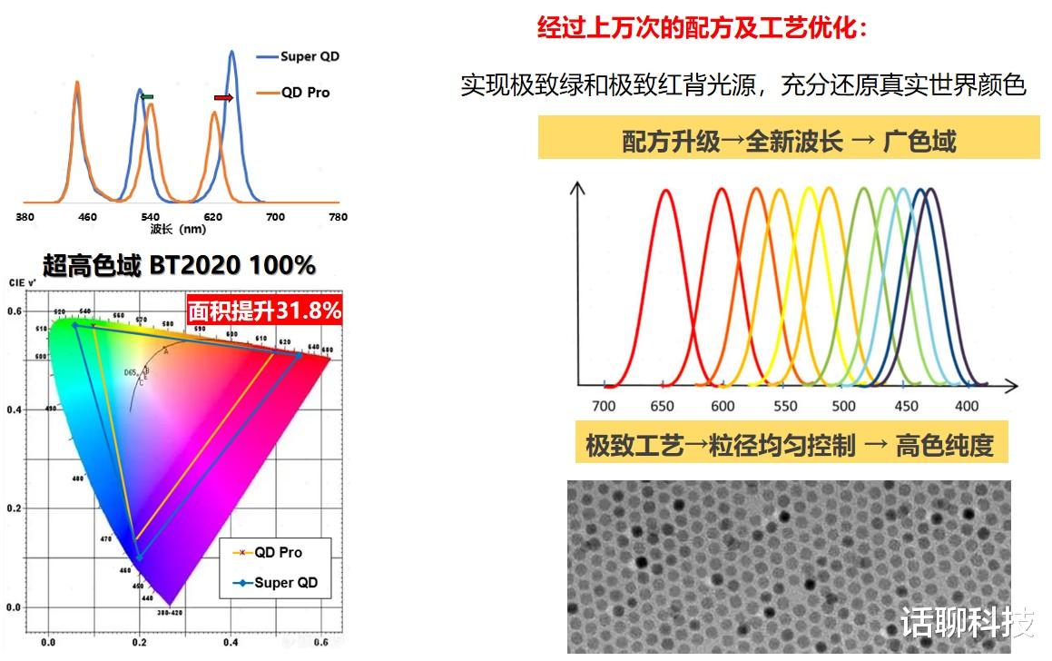 怎么实现的呢?通俗一点来说,一是材料配方改进,在压窄线宽的同时,把绿光做得更短、红光做得更长,荧光增益做得更高,让RGB三色混光得三角形区域更大,实现了超高色域BT.2020 100% ;二是采用更好的工艺,提升沉相温度,把量子点颗粒做得更细、分布得更均匀。
