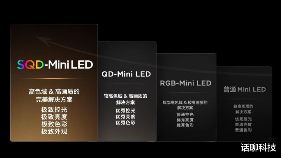 后来我也考虑过,怎么会如此明显?除了技术层面,SQD-Mini LED显示技术是后发布的技术,有点相互竞争的是时间差导致的原因;更有两种技术的各自差异,那就是全白色MiniLED单色灯珠,发光效率高、波长温漂小、阵列有效数量多、控光更容易有关,而且这种方案的成本相对更低,这也是能技术下放、推出普及款,打价格战的原因。