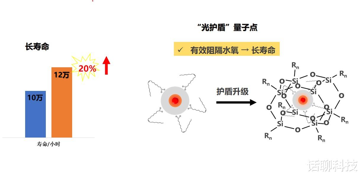 三是改进大分子键合,提升了稳定性,让量子点荧光寿命更长。可以实现12万小时不褪色的超长寿命,按照每天看电视6小时,也有50年寿命。