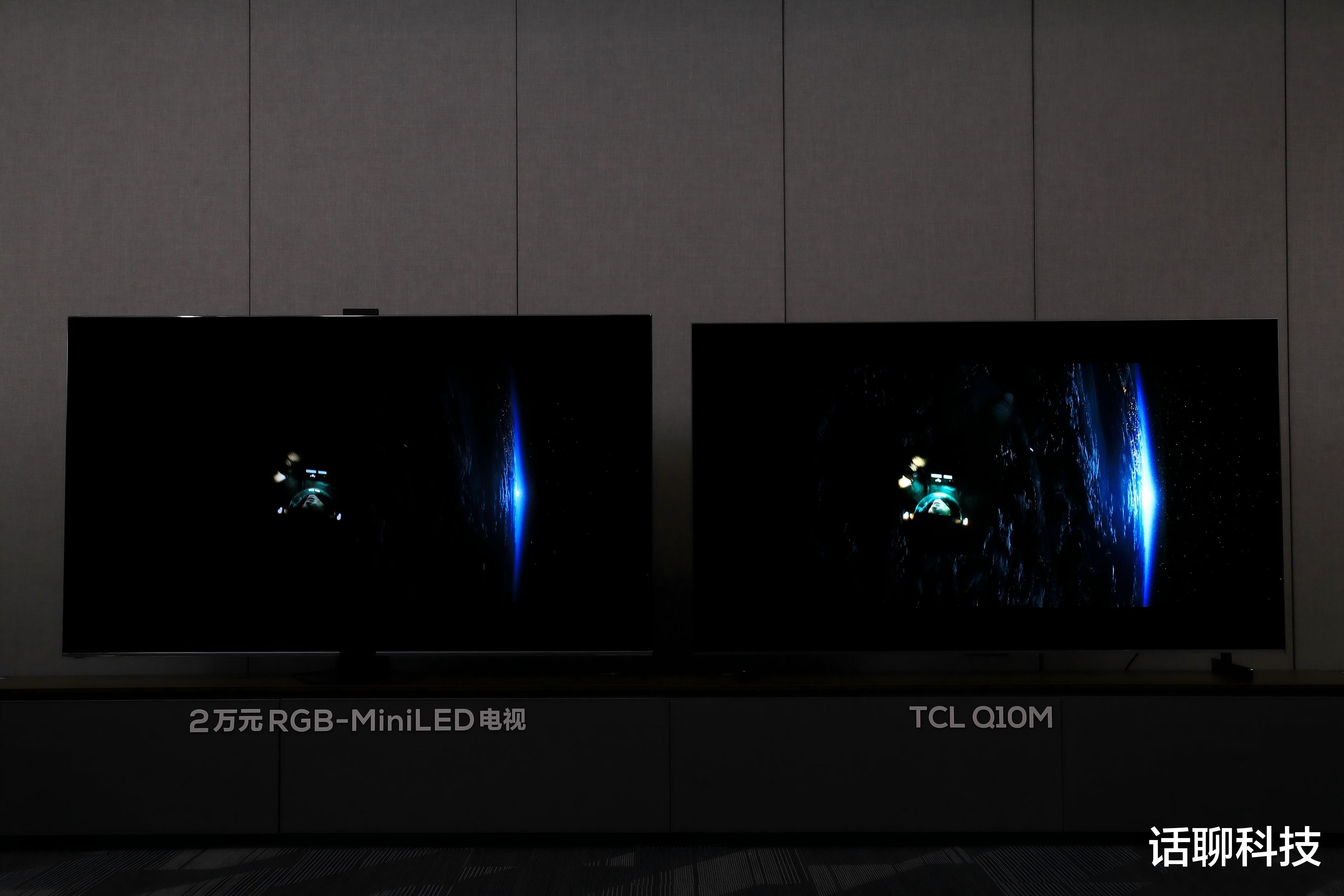 这次在品鉴会现场展示了Q10M、Q9M分别与2万价位的RGB-Mini LED 电视在标准画质下播放同画面的对比,给我的感觉是亮度、对比度、色彩这三方面确实TCL更占优势一点。比如播放这种黑色背景的黑人画面,Q10M的渐变黑色细节要更层次丰富一点,这是超高亮度、超细光控分区带来的对比度的优势。