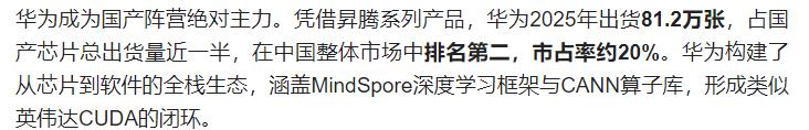 2025 年,升腾全年出货 81.2 万颗 AI 芯片,占中国整体市场 20%,稳居国产厂商第一、全市场第二,成为英伟达份额下滑的最大受益者。