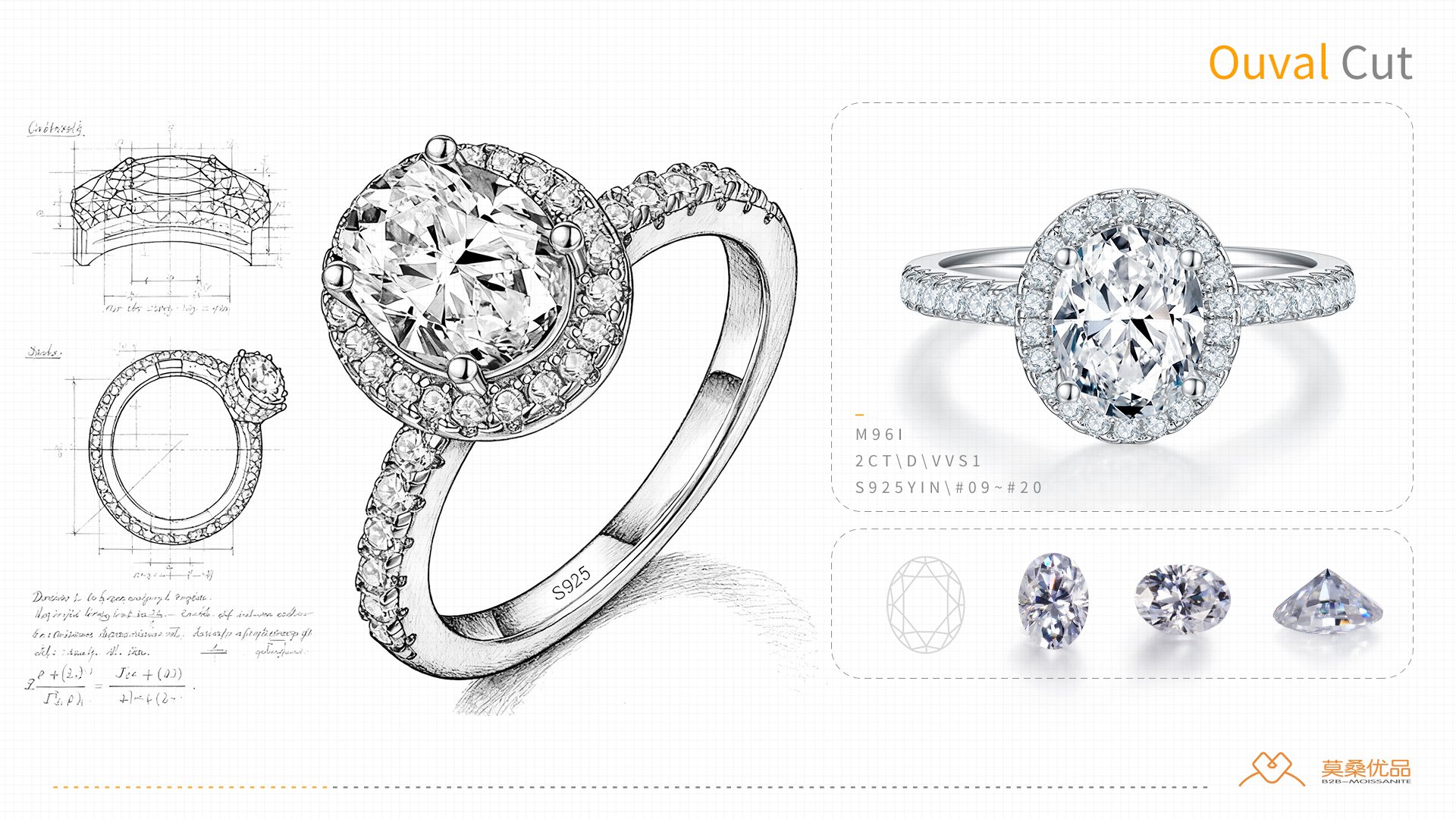 椭圆形钻石是圆形的 “拉长版”,刻面设计借鉴圆形,火彩柔和且显大 —— 同克拉的椭圆形钻石,视觉上比圆形大 15%-20%,预算有限想显钻的人可以优先考虑。它的弧度线条能贴合手指曲线,不挑手型,搭配素圈戒托显温柔,搭配碎钻围镶显华丽,是近年异形钻中的 “黑马款”。