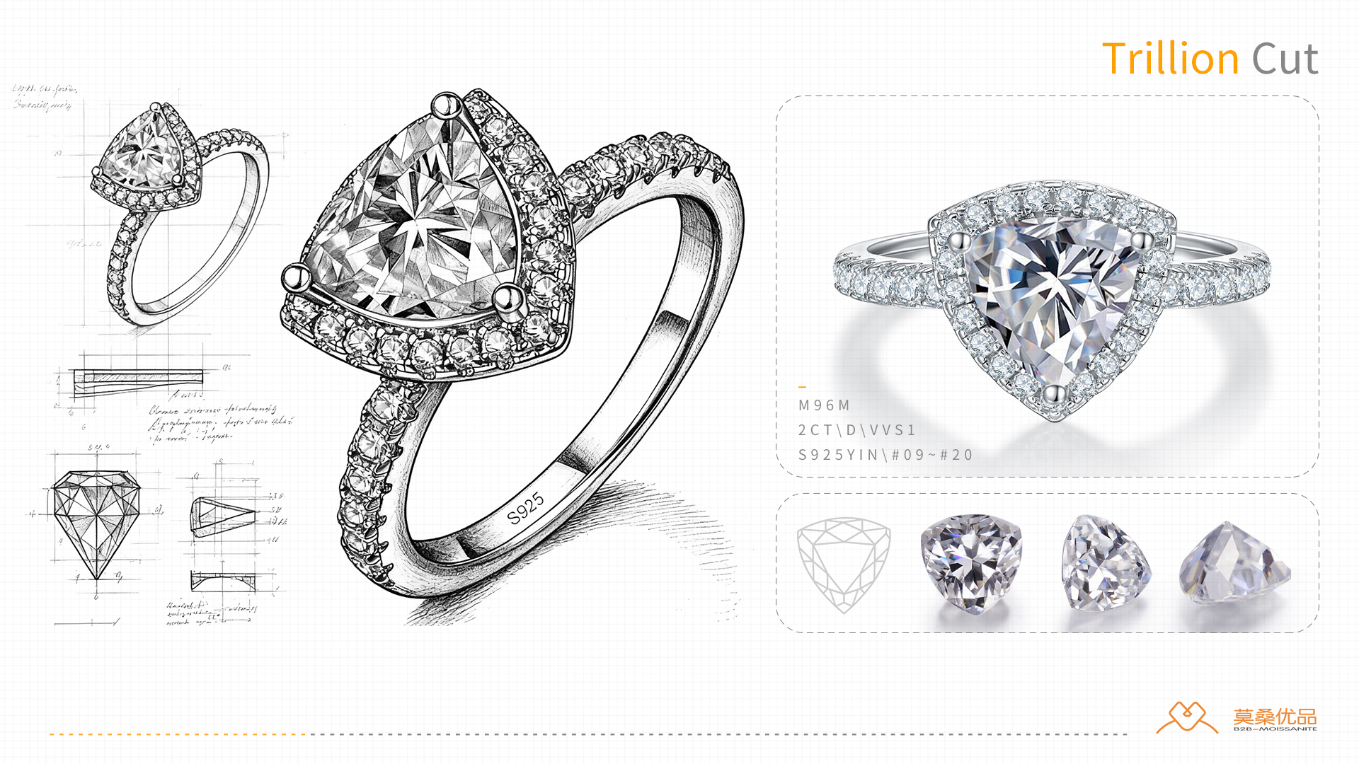 三角形钻石以锐利的棱角与对称的轮廓,构筑出极具张力的视觉冲击。这种独特的切割方式,将钻石的璀璨光芒通过三个主面折射释放,搭配亭部的精巧切面设计,在光线流转间绽放出多层次火彩,如同凝固的闪电般夺目。得益于独特的几何造型,同克拉数的三角形钻石在横向视觉上更为开阔,镶嵌于戒指时能巧妙延伸手指线条,尤其适合偏爱极简风格或希望突显个性的佩戴者。