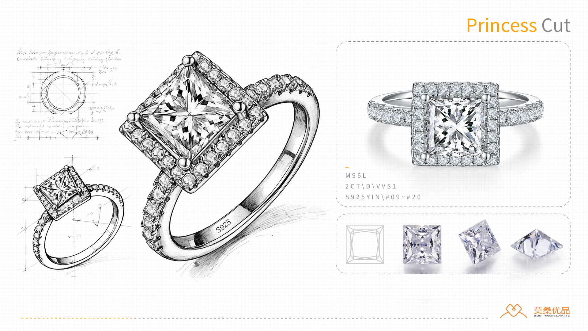 公主方形钻石有 4 个尖角和 4 条直边,刻面多呈三角形或菱形,火彩虽略逊于圆形,但胜在轮廓利落,自带优雅感。它的台面(顶部平面)比同克拉圆形钻石更大,视觉上更显钻,且方形线条能修饰圆润手指,冷白皮佩戴还能衬得肤色更通透,适合喜欢简约现代风格的人。