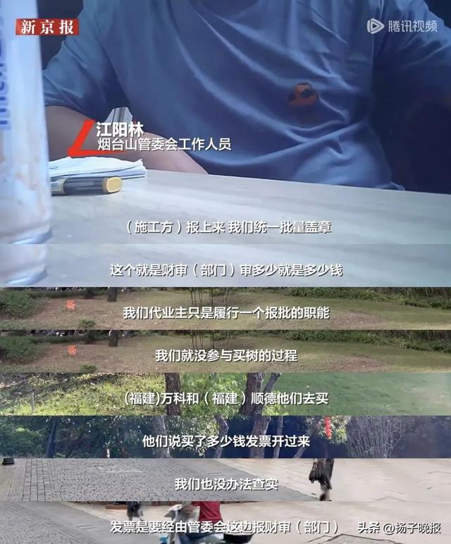 举报人江先生称,这些“天价树”属于烟台山公园的景区改造绿化项目,由一位叫余云的“工头”向他采购,事后两人产生了经济纠纷。