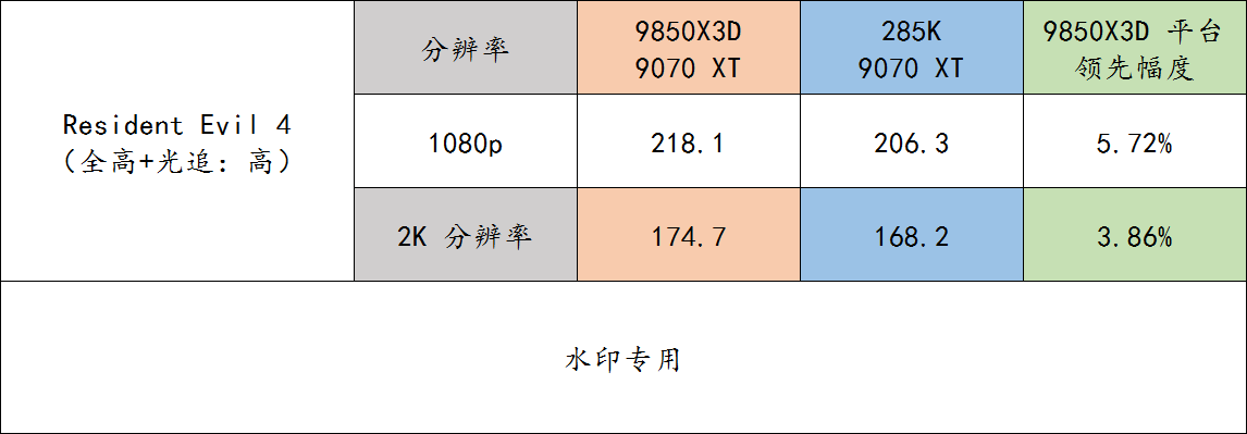▲ 《生化危机 4 重置版》游戏实测。作为动作天尊卡普空 2026 即将推出的 《生化危机 九》的预演,本次的 RE4 实机实测更具有指导意义,方便用户可以根据需求来制定配置单, 9850X3D 的表现更好。