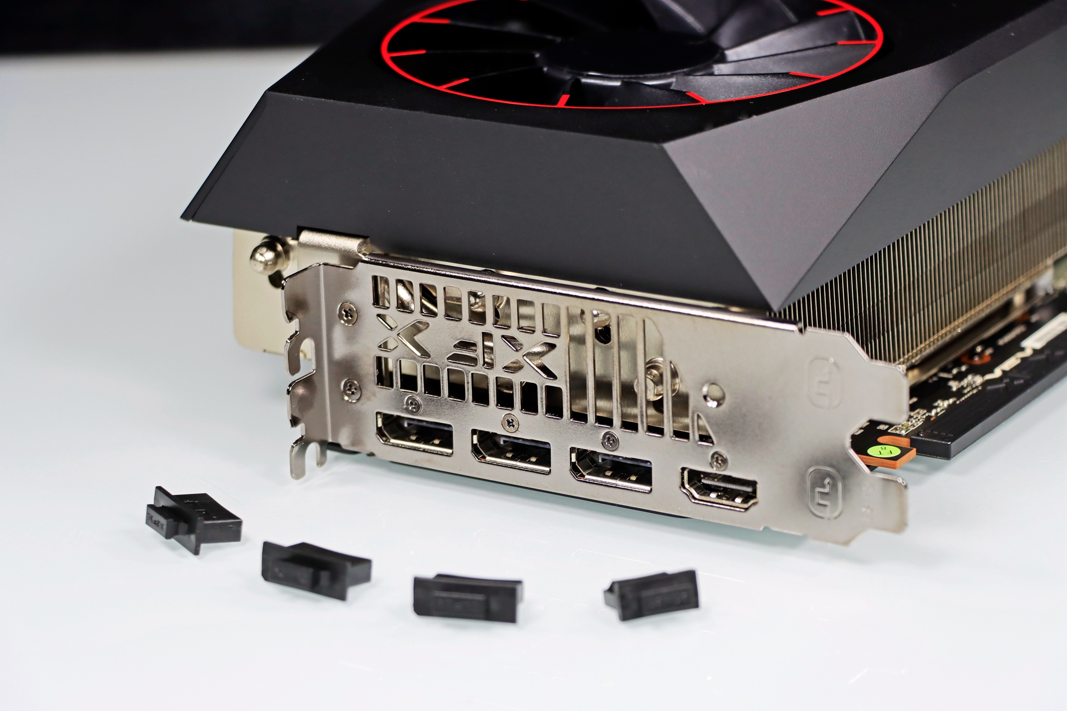 ▲ 显卡提供 3 * DP + 1 * HDMI 显示输出接口,都可以支持最大 8K 分辨率图像输出,都配备有防尘塞。