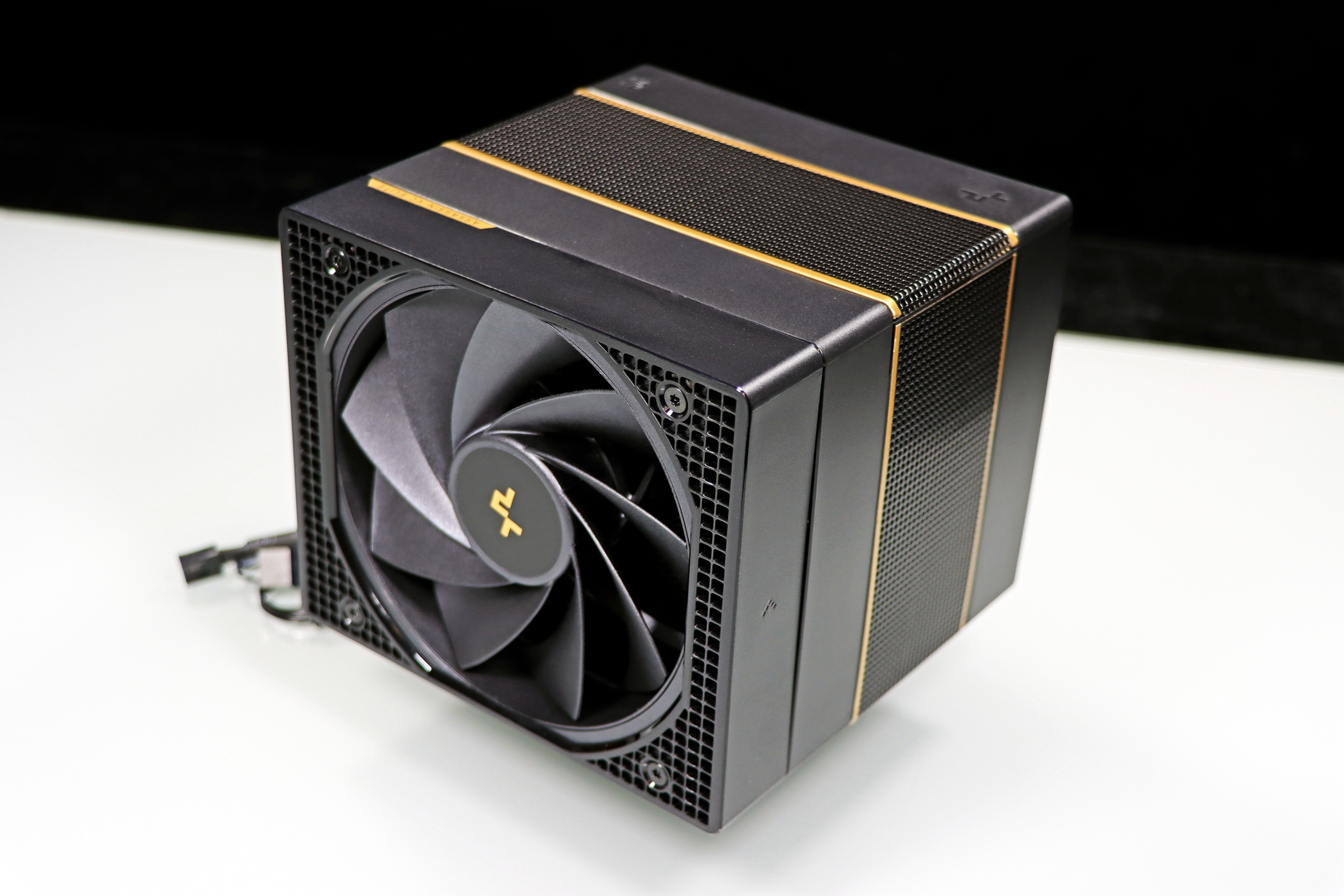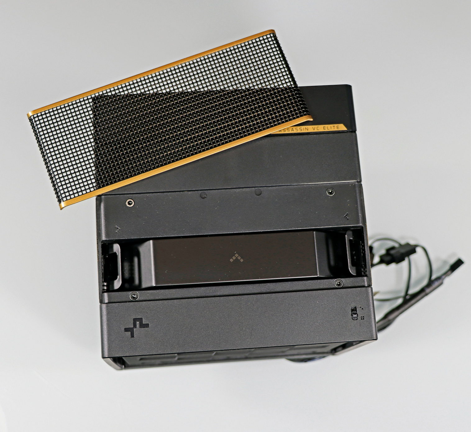 ▲ 散热器顶部的视角。散热矩阵防尘网的描金边与顶部的 阿萨辛 VC 至尊版的独特至尊铭牌设计相得益彰,让散热器整体看上去高端大气上档次。