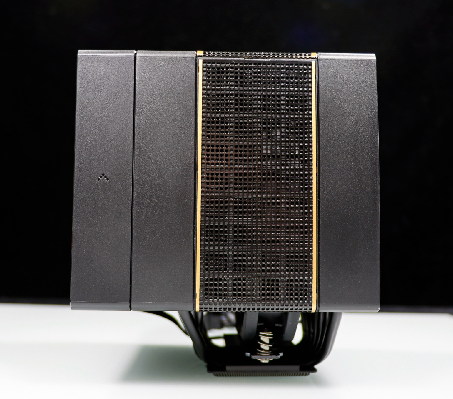 ▲ 散热塔体通体采用导流罩加以包裹。散热塔体为双塔设计,两塔体中间为中置 14025 包胶散热风扇。中置风扇区域采用大面积散热矩阵防尘网设计,并在滤网的周边采用描金边的艺术设计,让整体更加美观大方。