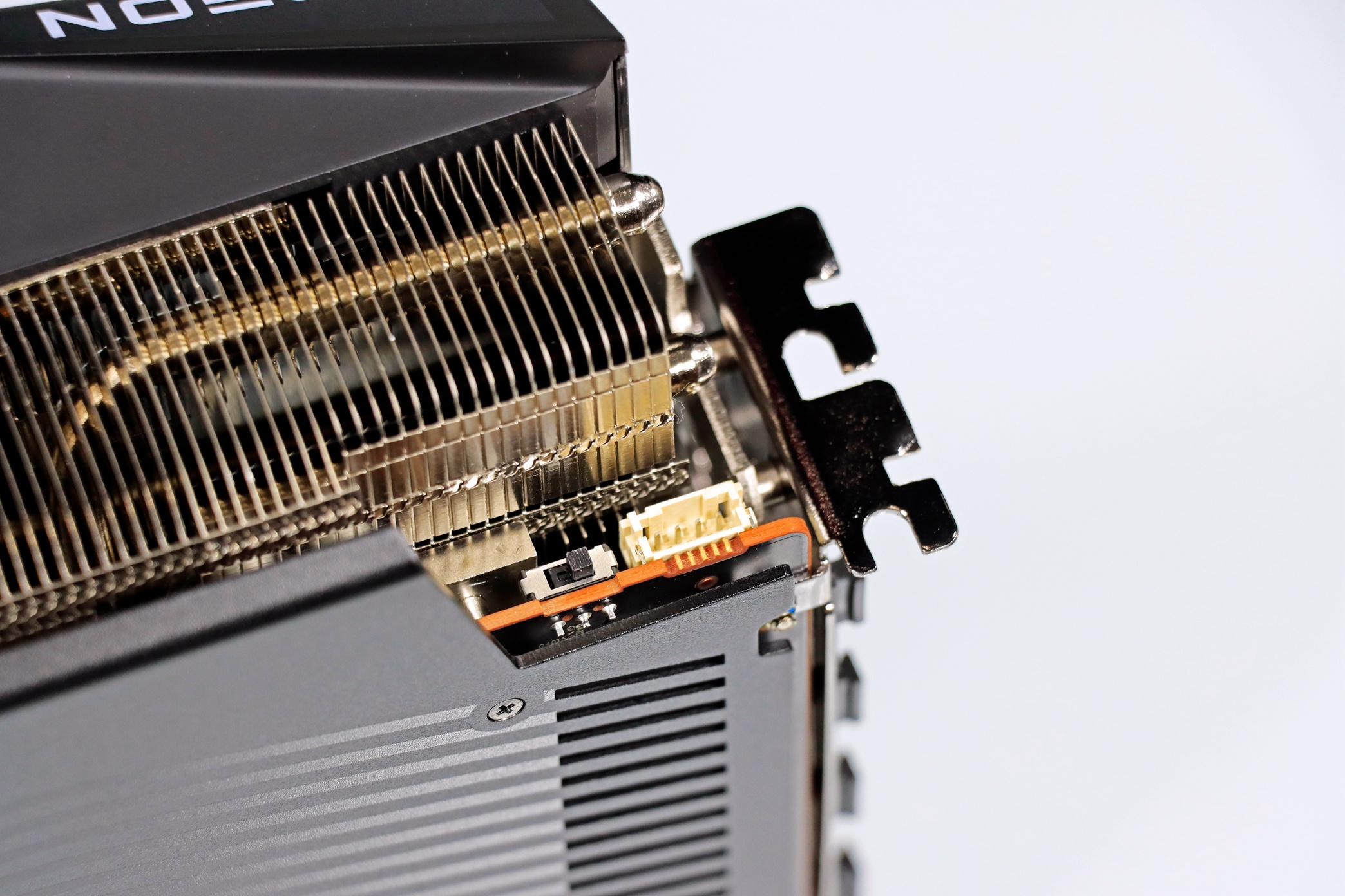 ▲ 在靠近显示输出接口端处有双 bios 切换开关,以及RGB 信号线接口。此外可以看到显卡采用全新Z-BAR隐藏式支架,拥有承力更强的优点,保护显卡PCB与主板减少形变,延长使用寿命!