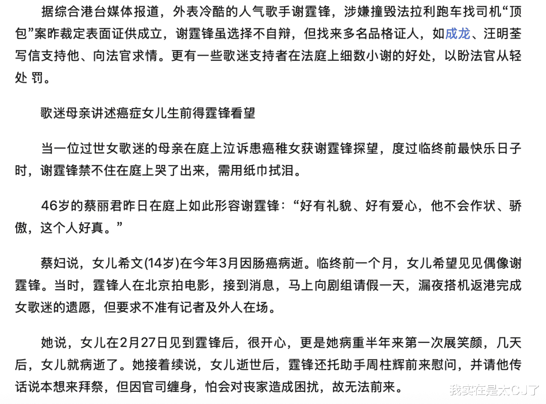 回翻那时候的新闻,会觉得要素真的好全,又是顶流身价公开,又是成龙、汪明荃这种巨星争做品格证人,还有合作过的工作人员以及歌迷现身法庭为其求情。