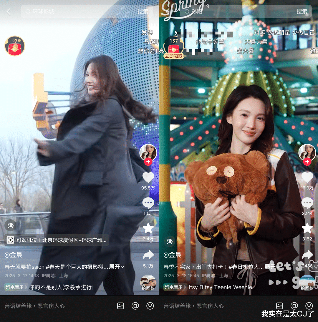 而且看她的社交平台,去年3月16号出事后居然还连续两天更新了在北京环球影城玩耍的视频👇
