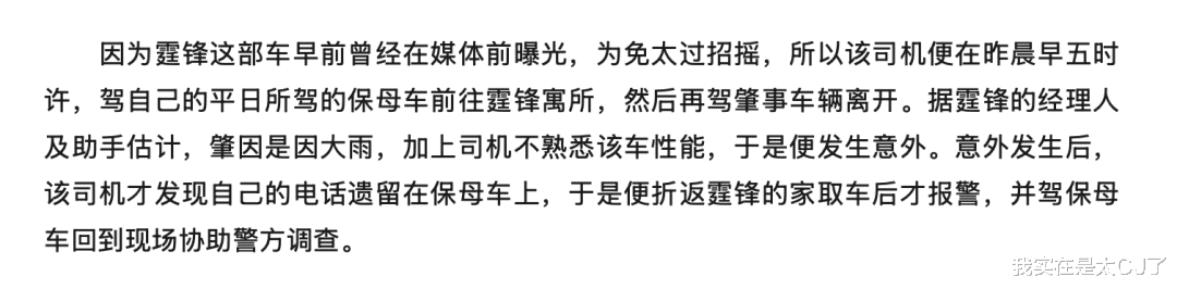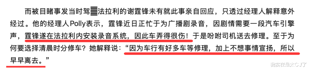 当时谢霆锋的经纪人Polly给出的说法是,出事的法拉利本来就有点问题,后来做音乐拿它来录声音就更损耗,为了避免太招摇就拜托英皇司机成国定帮忙把它开去修。