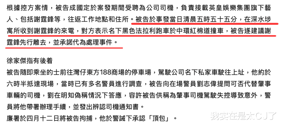 据控方所述,出事后谢霆锋给成国定打电话说自己撞了车,成国定建议他马上离开,之后自己打车去湾仔取保姆车,6点半开到案发现场,跟正在调查的刘志伟说打算顶包当“肇事者”,而刘志伟是知情、同意且配合这一切的。