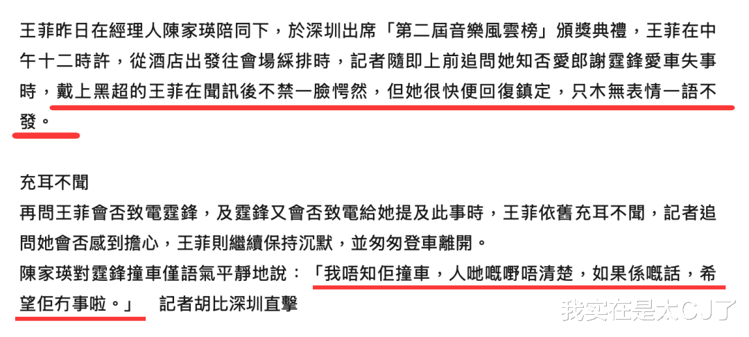 记者其实还去问了王菲知不知道谢霆锋撞车,说她“闻之错愕”随后沉默离开,经纪人陈家瑛的回答算是划清界限,说这是“别人的事”所以不清楚。