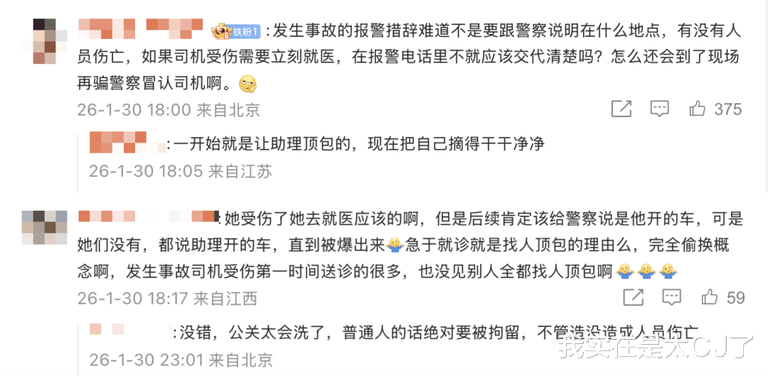 但猜测仍未停止。有人认为金晨后续还有赛车综艺录制+汽车代言,背着“交通肇事”这么个负面标签很难保住这两项工作,只能找助理去背锅。