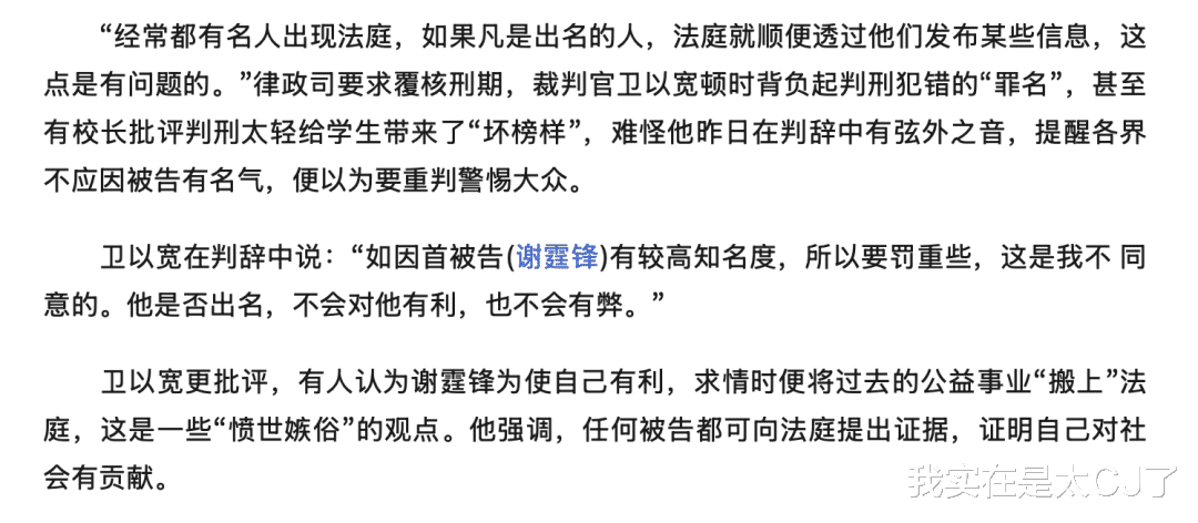 负责此案的裁判官卫以宽还特别在判辞里表明,“如因首被告(谢霆锋)有较高知名度,所以要罚重些,这是我不同意的。他是否出名,不会对他有利,也不会有弊。”