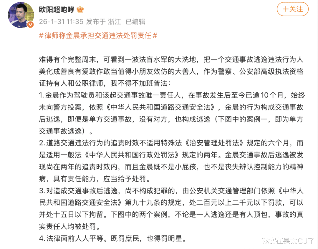 身为警察+公职律师的欧阳超就认为,既然柯桥警方要成立专案组来调查这件事,说明作为驾驶员+唯一责任人的金晨在狗仔爆料前没有主动投过案,那事实就构成了逃逸,应该要按照两年这个效期对其进行追责和处罚。