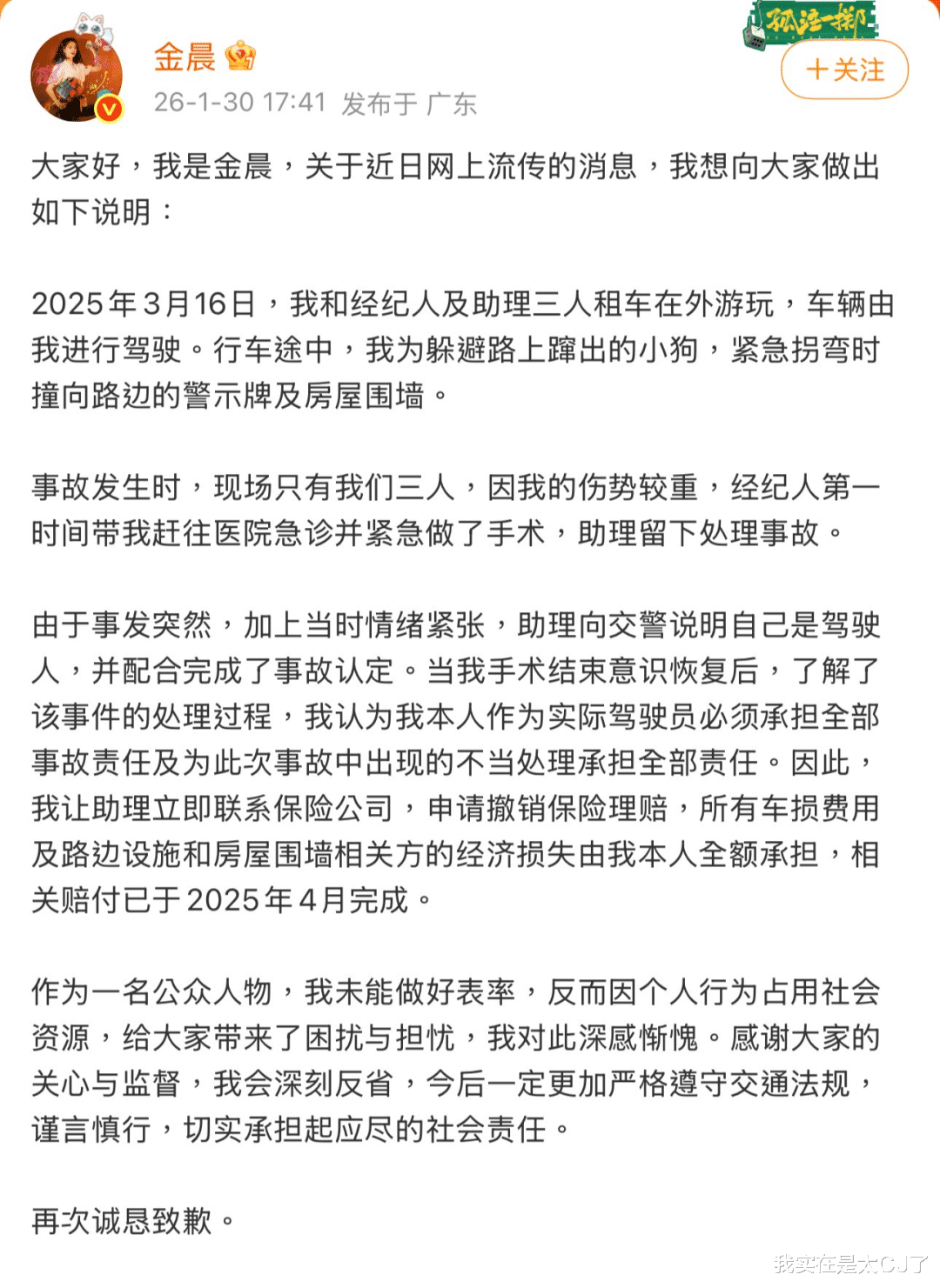 金晨本人回应是紧跟着通报来的,所述内容和警方发布大体一致:出去玩的时候为了躲突然窜出来的小狗,紧急拐弯出了交通事故,自己伤势较重所以经纪人第一时间带着去急诊+做手术。