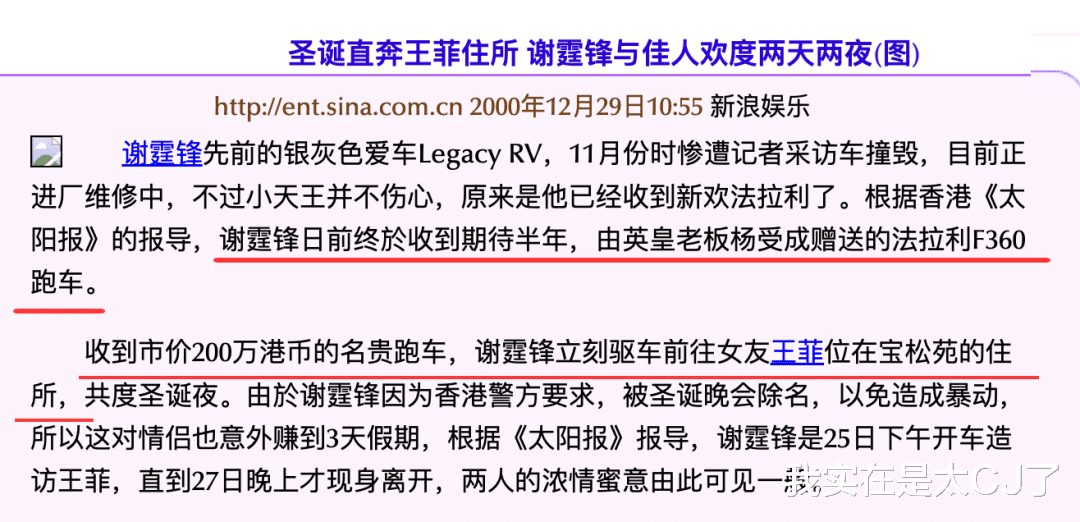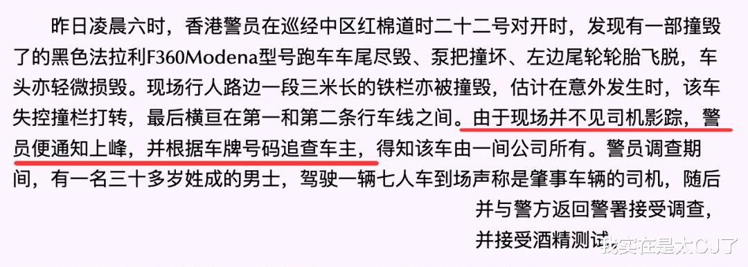 可查着查着又发现不对,因为出事的黑色法拉利F360曾经上过新闻,是杨受成送给谢霆锋的,说是他拿到就找王菲约会了。
