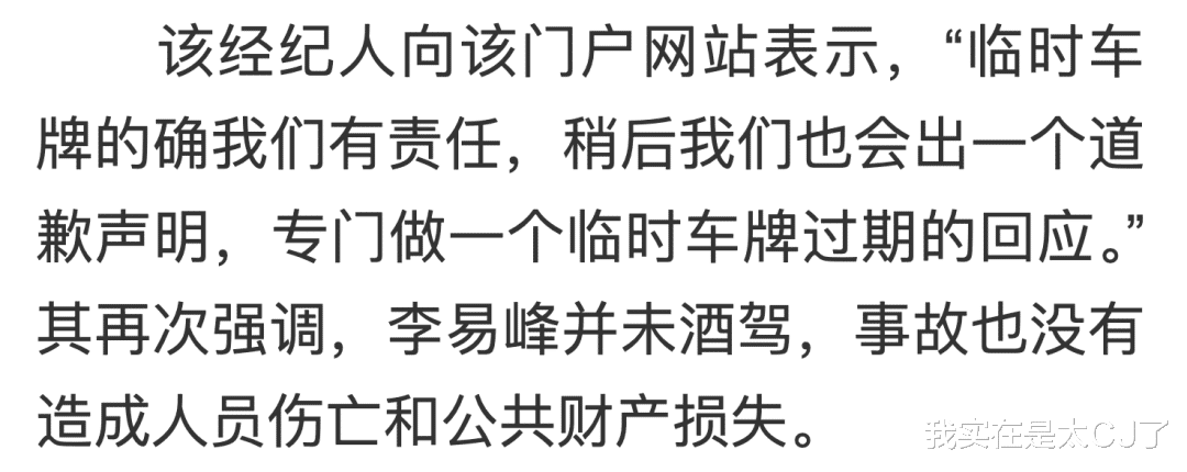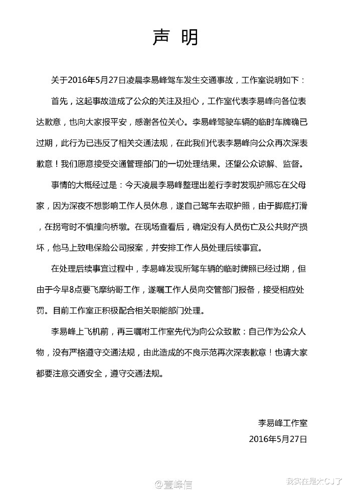 5月27号晚上,李易峰工作室才发了封声明,说辞大概跟经纪人受访时一样,也承认临时车牌过期是违反交规的。