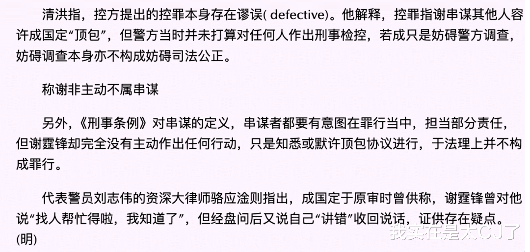 2.谢霆锋没有主动做出什么行动,最多只是知悉或默许顶包协议进行,于法理上并不构成串谋罪行;