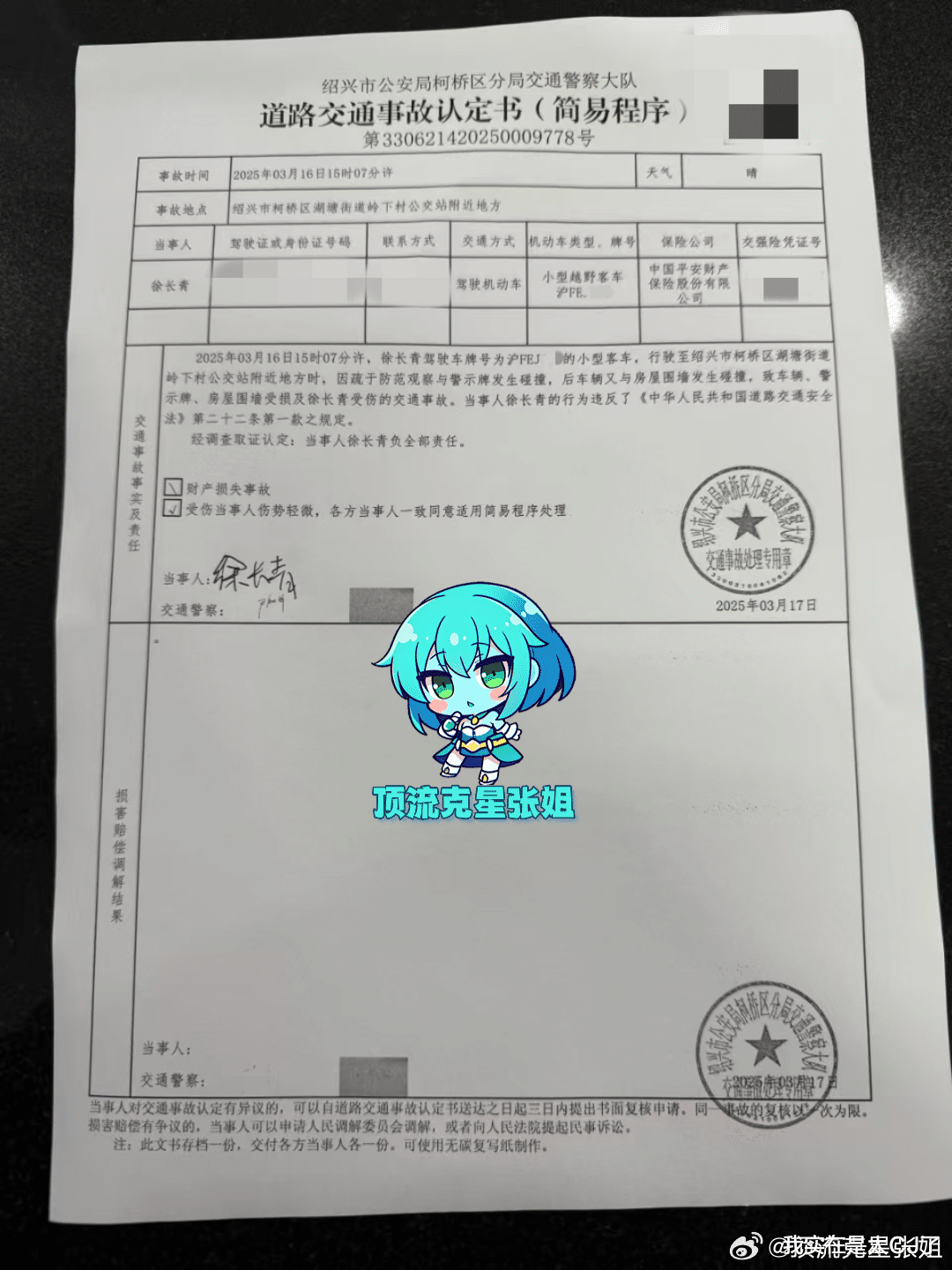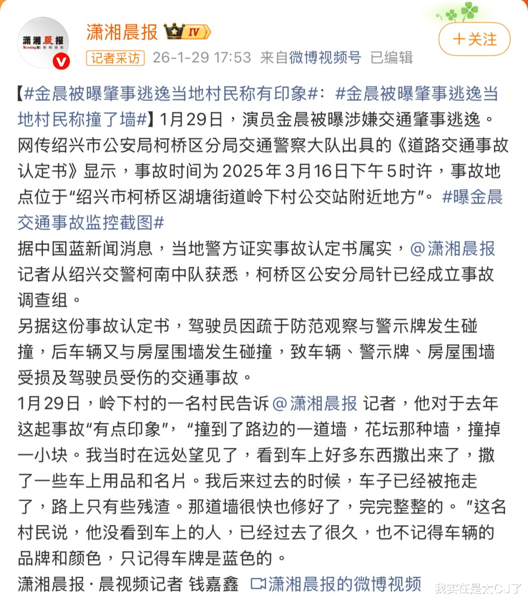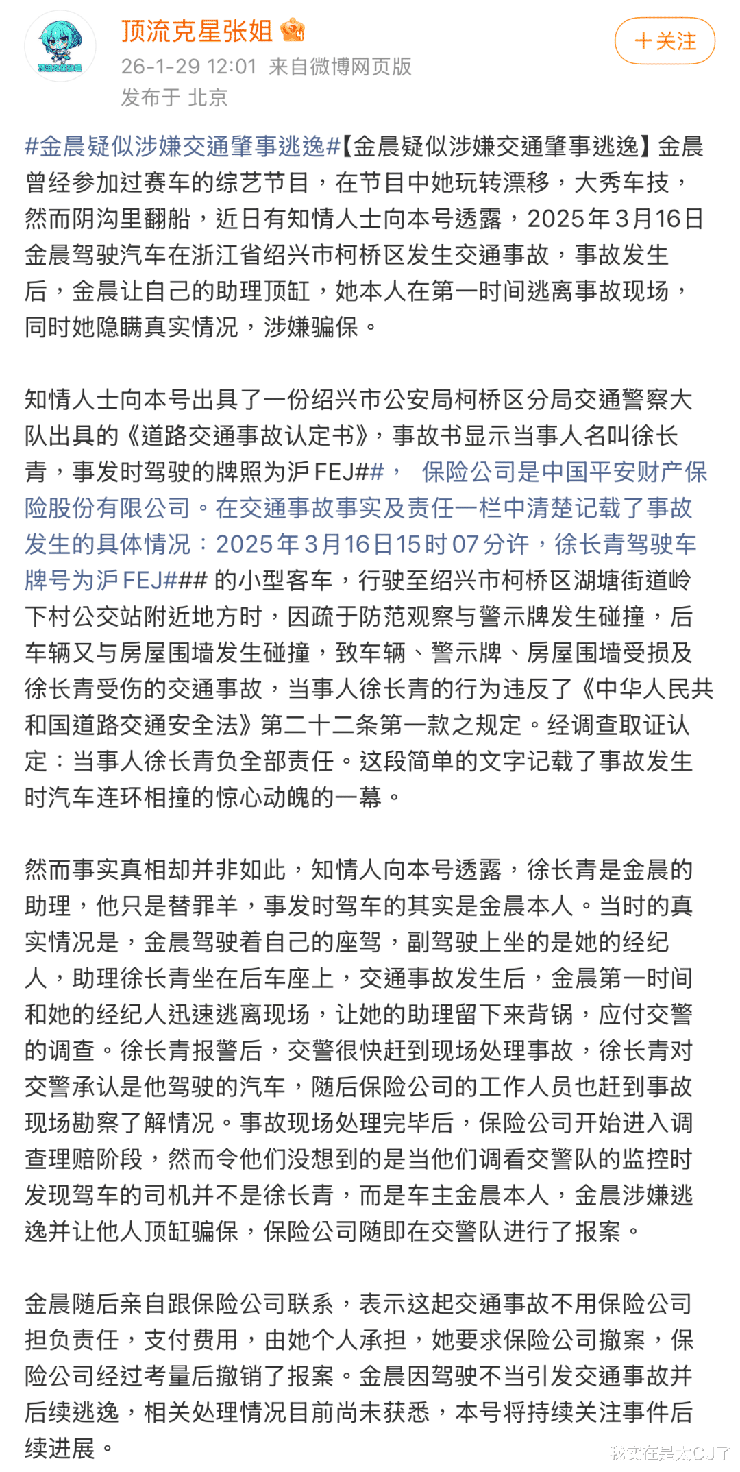 几百个字几重翻转,把金晨描述成了一个车技不佳、颐指气使还贪心嚼不烂的形象,随文所附那份事故认定书也很快被当地警方承认。