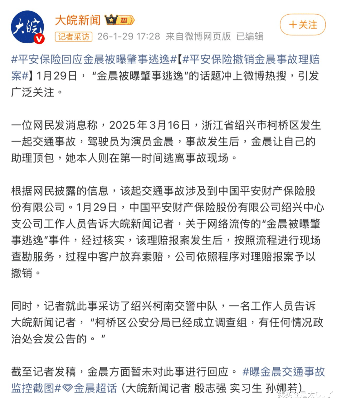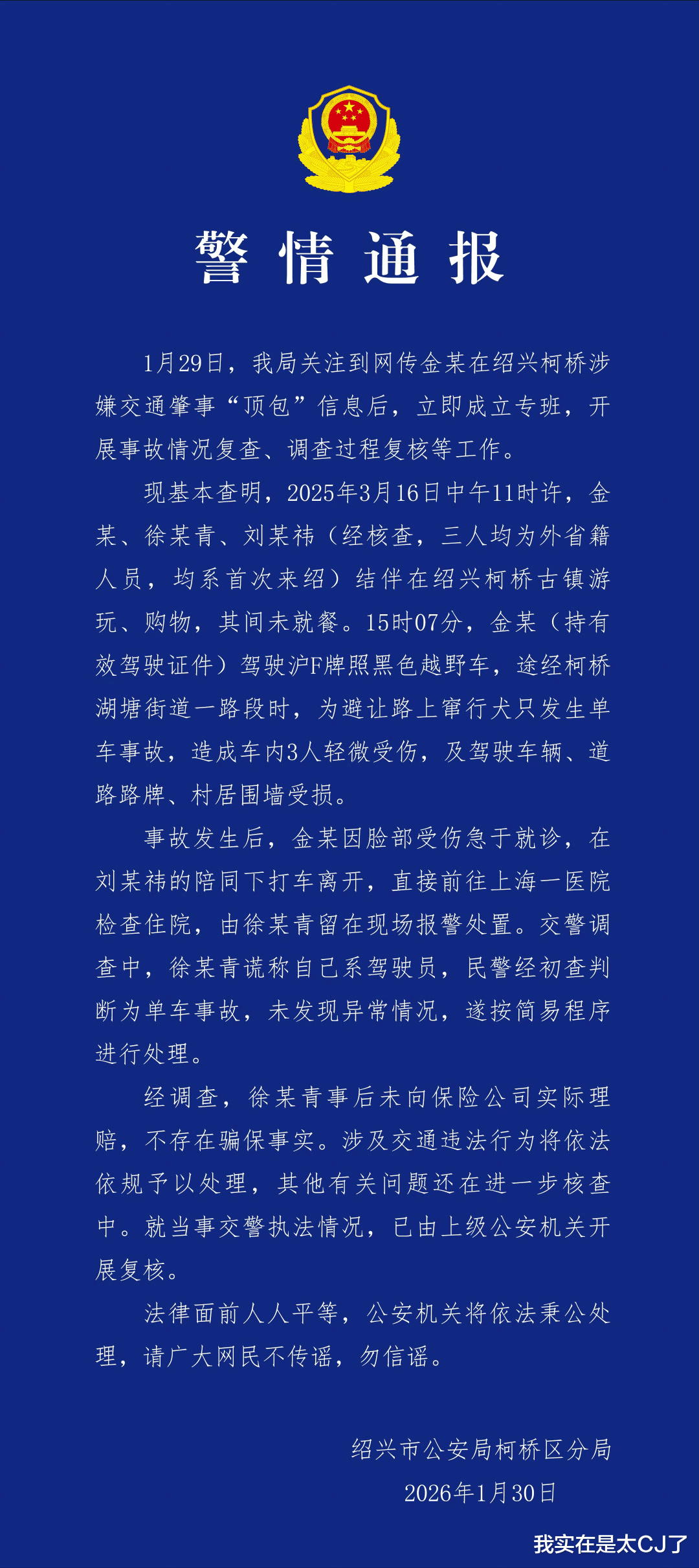 猜测到1月30号下午才停下来,绍兴市公安局柯桥分局就此事发布警情通报,特意提及金晨到柯桥游玩期间没就过餐,也就不存在酒驾可能。
