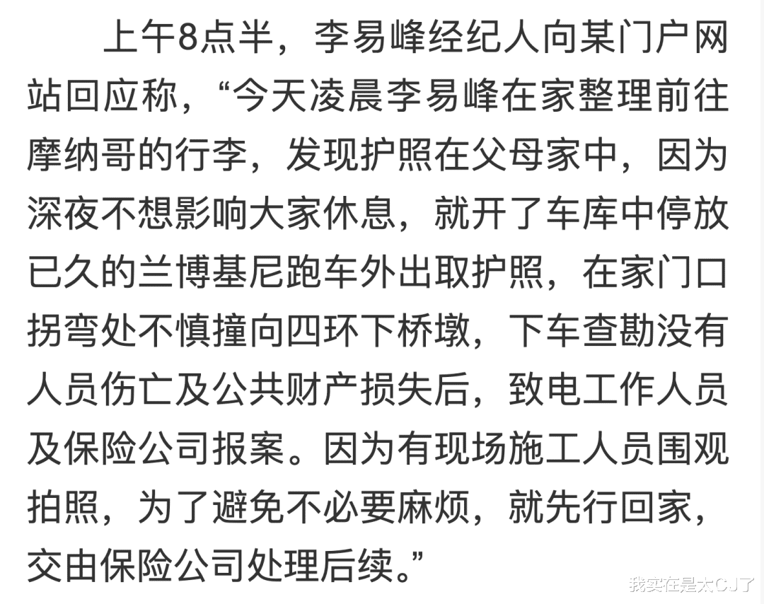 过了几个小时,经纪人又在另一家采访里承认确有其事,说李易峰要出国了发现护照在父母家,急着去拿结果太久没开车又开了辆不熟悉的车,低头弯腰捡手机的时候脚底一打滑就给撞了。