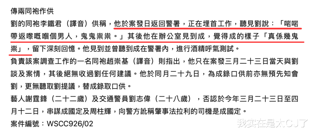 同样被告的刘志伟还当庭辩称23号出警时就觉得成国定不对劲,曾向同事表示过怀疑,此事多名同事可以作证,自己也没有理由纵容包庇谢霆锋。