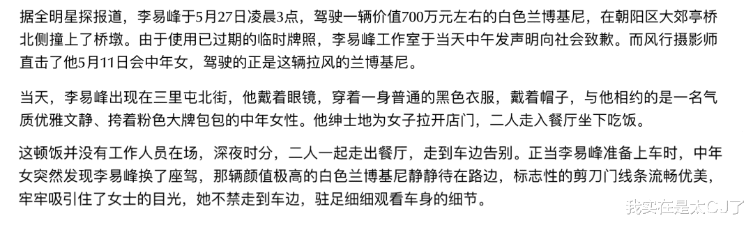 语气有点轻描淡写,内容也无法让人信服,毕竟卓伟团队5月11号拍到过李易峰开这辆兰博基尼出去和朋友吃饭,朋友还特意看了看兰博基尼的车身细节。
