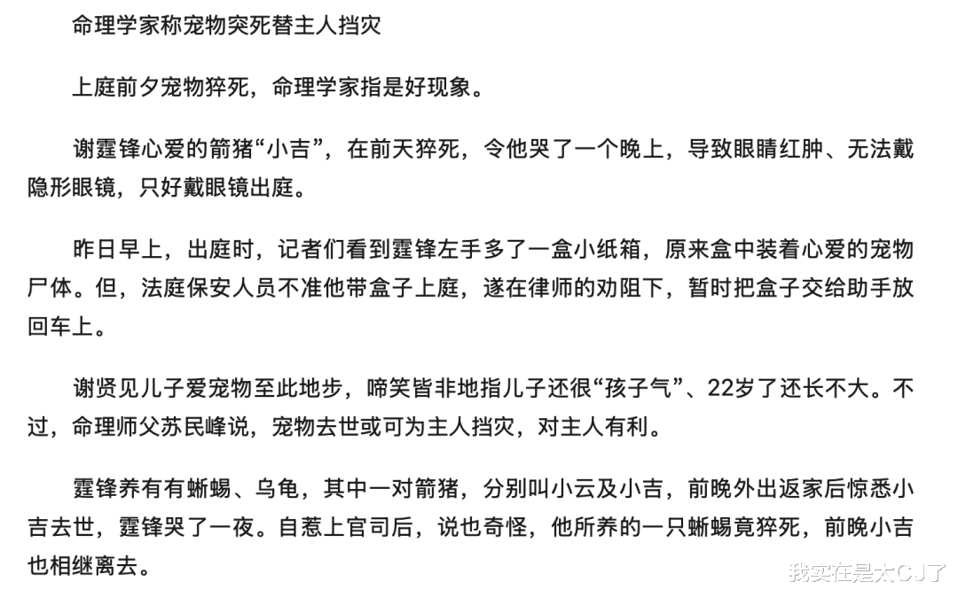 又写谢霆锋戴眼镜出席是因为头天宠物小猪去世哭了一夜眼睛好肿,甚至还找了命理师苏民峰受邀分析“宠物去世或可为主人挡灾,对主人有利”……娱乐属性拉满。