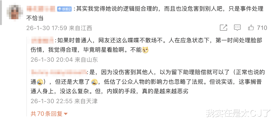 至少部分网友会觉得,明星本来就靠一张脸吃饭,脸都伤成这样了自然会慌张想要先做处理,顾不上别的事。