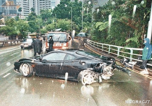 让我们把时间倒回到2002年3月23日凌晨,一部黑色法拉利F360在行至香港中环红棉路时因为雨天路滑突然失控,撞到路边防撞栏后又弹到慢道上,以至于尾部严重损毁,一个车胎及车尾泵把飞脱。