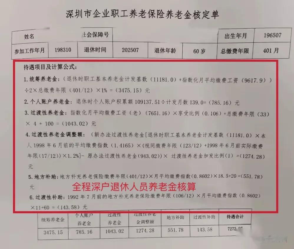 统筹养老金=(退休时深圳基本养老金计发基数11181元+指数化月平均缴费工资9617.9元)/2*总缴费年限401/12*1%=3475.15元。