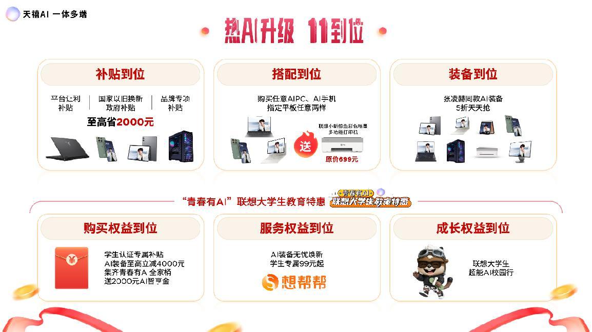 双十一临近,联想推出“热AI升级 11到位”超值优惠,包括六重福利到位:首先是“补贴到位”,通过整合国家以旧换新、品牌补贴及平台三方补贴,部分机型最高可省2000元。在搭配购机需求上有“搭配到位”,购买任意PC、平板,相关配件可享限时五折打包带走;更直接为选择特定手机型号的用户,赠送价值299元的专属AI耳机;在AI PC、指定AI手机和AI平板中任选两样,即可将价值699元打印机免费搬回家。此外,双十一期间在官方店铺下单即有机会以五折抢购张凌赫同款AI装备。