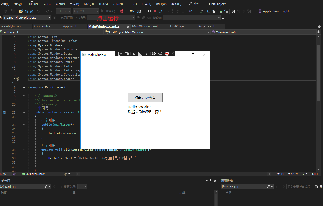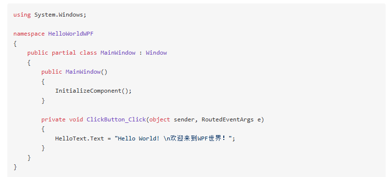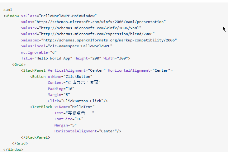 2. 项目结构说明HelloWorldWPF/├── Properties/├── App.xaml // 应用程序入口├── App.xaml.cs├── MainWindow.xaml // 主窗口定义└── MainWindow.xaml.cs