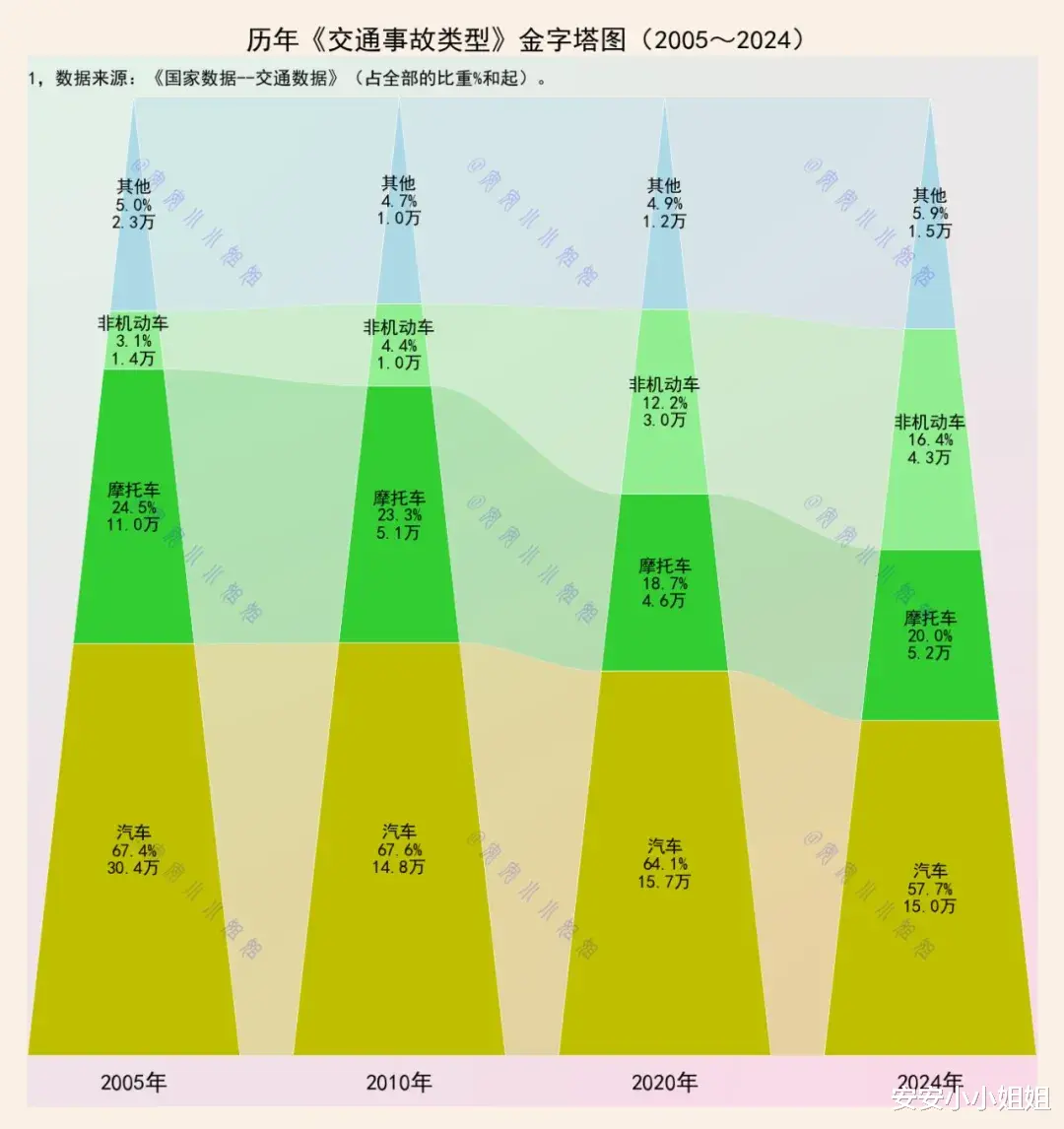 回顾2005年的数据金字塔,汽车以高达67.5%的事故占比高居塔顶,构成当时道路安全的主要矛盾。