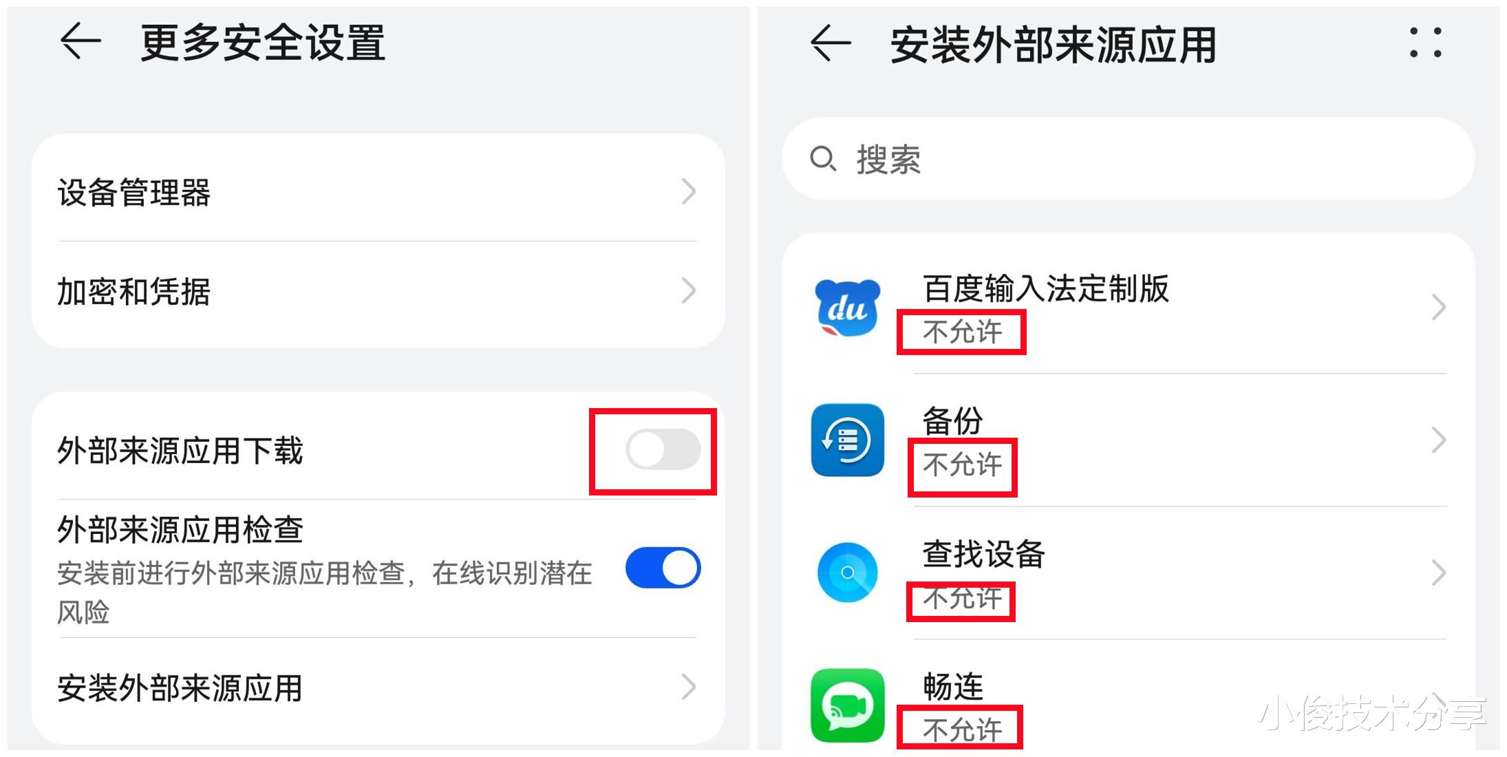 那么在这个页面中,就可以看到安装外部来源应用了,我们点进去,大家看,在下面找到所有带有允许两个字的软件,然后我们点击这个软件,把允许安装应用开关关掉,如果你手机上有多个允许的,一定要挨个把它们通通关掉,这样就可以避免手机下载安装恶意软件了!