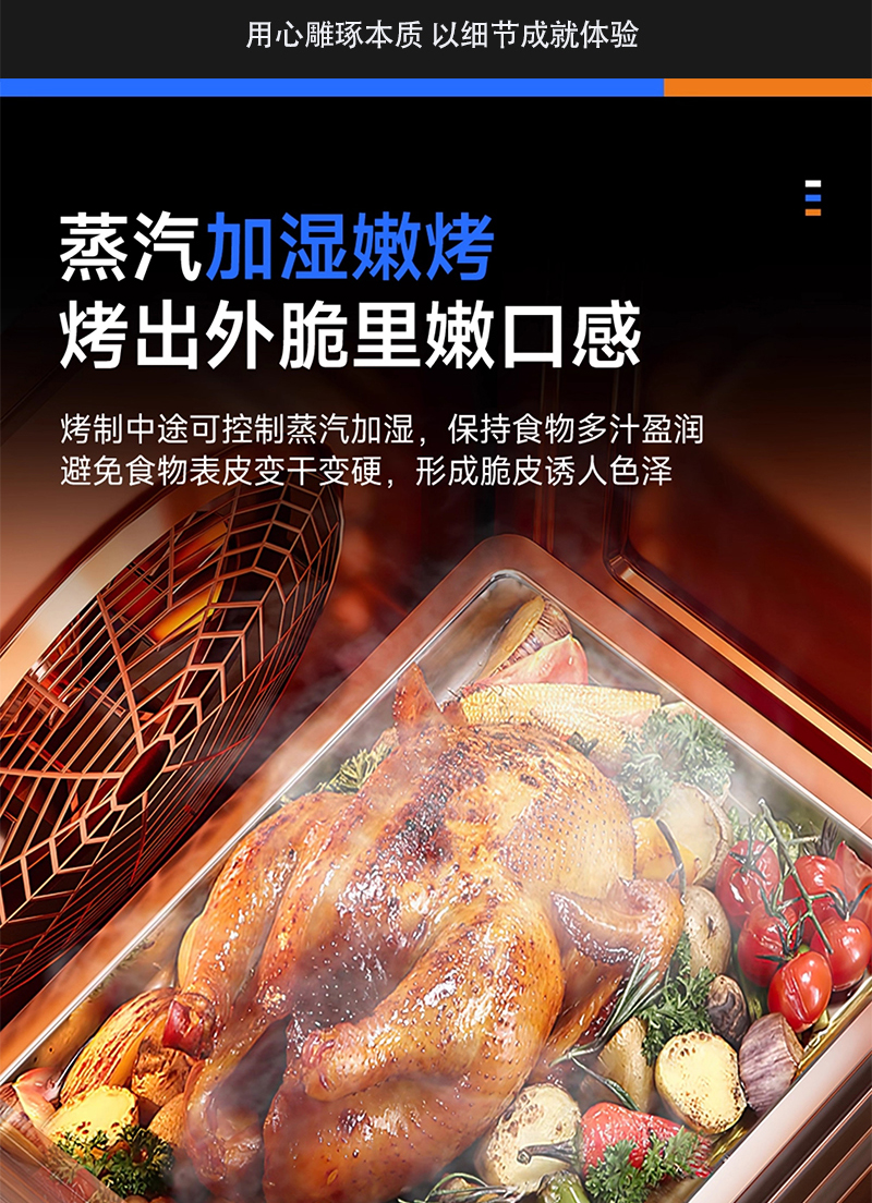 做10人份和50人份的烤鸡,熟度总不一样?“质量调控”功能自动检测食材装载量,中心温度探针,通过调整时间确保不同份量的菜品口感一致。