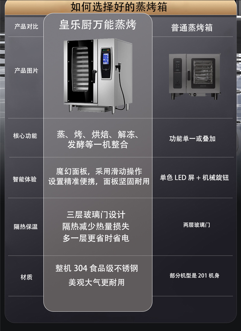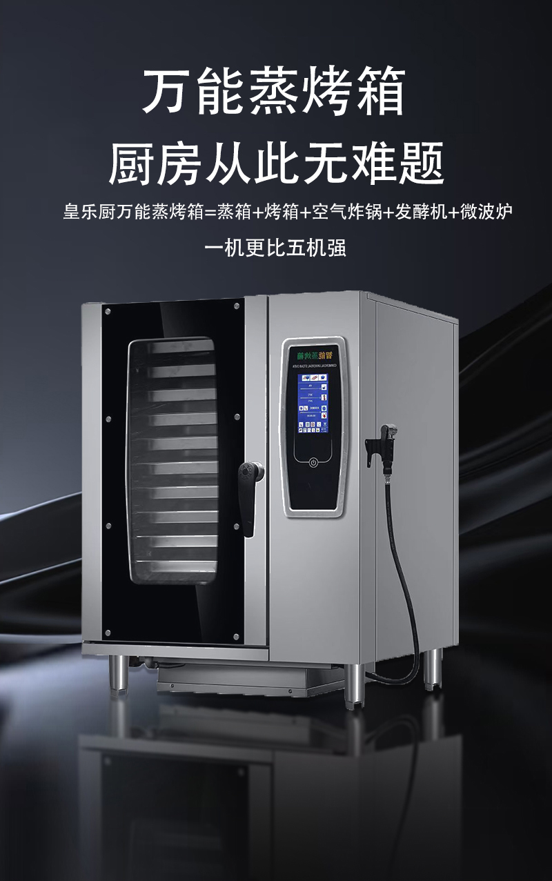 餐饮老板们是否还在为厨房堆满蒸柜、烤箱、而头疼?后厨过道被设备挤占得仅容一人通过,新菜品想上线却没地方放新机器——这是多数商用厨房的“空间焦虑”。商用万能蒸烤箱的出现,正是为打破这种困局而来。它集焙烤、架烤、蒸焖等全功能于一体,一台设备就能替代传统烤箱、蒸柜、甚至部分微波炉的作用,直接让厨房设备数量减半。,厨房空间利用率提升40%,过道宽度从0.8米增至1.5米,后厨流转效率直接提高25%。